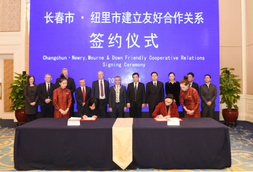 10月11日,在中共吉林省委常委、长春市委书记王君正,长春市代市长王路,吉林省人民对外友协副会长呼应以及北爱尔兰Mark Murnin市长等中外领导的见证下,秦和校长代表我校与英国奥斯特大学校长代表刘艳签署教育合作备忘录。