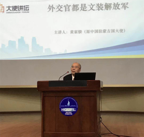 11月8日晚,应秦和校长邀请,原中华人民共和国驻蒙古国大使黄家骙走进我校“大使讲坛”,在多功能报告厅为全校师生作了《外交官是文装解放军》的主题讲座。