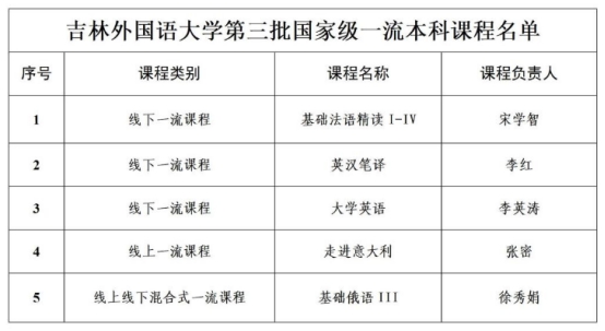 近日,教育部高等教育司发布《关于第三批国家级一流本科课程认定结果的公示》,吉林外国语大学《走进意大利》《基础俄语 III》《基础法语精读 I-IV》《英汉笔译》以及《大学英语》共5门课程获评国家级一流本科课程,涵盖线上一流课程、线下一流课程及线上线下混合式一流课程三大类别。