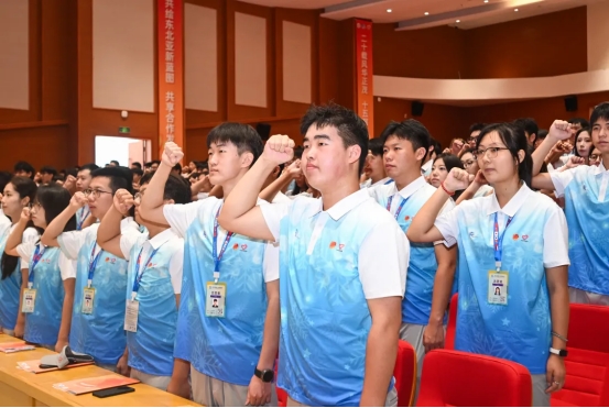 誓师大会上,与会领导为高校志愿服务集体授旗。志愿者们集体宣誓,将用最优质的志愿服务向与会来宾宣传推介吉林,树立和展现吉林青年的良好形象。