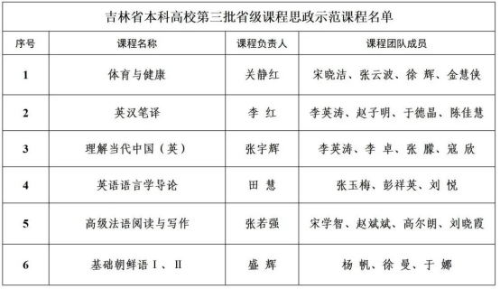 近日,吉林省教育厅公布吉林省本科高校第三批省级课程思政示范课程名单,吉林外国语大学《体育与健康》《英汉笔译》《理解当代中国(英)》《英语语言学导论》《高级法语阅读与写作》以及《基础朝鲜语Ⅰ、Ⅱ》共6门课程获批省级课程思政示范课程,涵盖体育、翻译、语言文化等多领域,充分彰显了学校课程思政建设水平与育人实效。