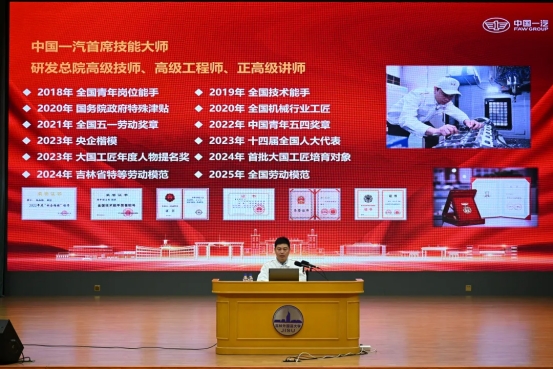 10月15日,第十四届全国人大代表、中国一汽首席技能大师、首批大国工匠、国家级技能大师工作室领衔人杨永修以《青春逢盛世 奋斗正当时》为题,为2025级新生讲授入学教育课,千余名师生参加活动。