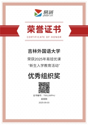 近日,由教育部易班发展中心组织的2025年易班优课新生入学教育活动圆满结束。吉林外国语大学易班学生工作站荣获“优秀组织奖”。