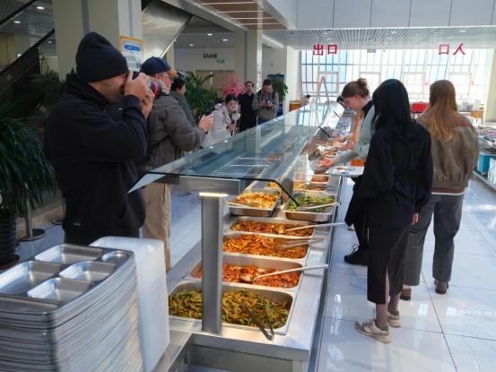 俄罗斯媒体记者走进食堂,拍摄用餐环境