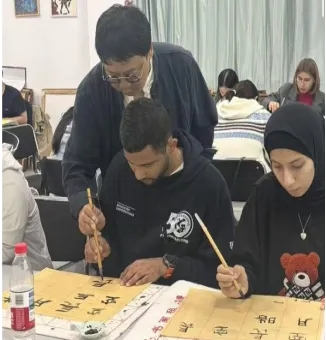 中国书法教师李岗指导留学生书法技巧