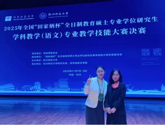国际传媒学院2024级学科教学(语文)专业硕士研究生姜怡彤(左)与指导教师马双(右)在比赛现场