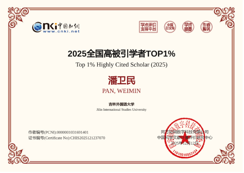 12月12日,中国知网发布“2025全国高被引学者”遴选结果。吉林外国语大学高级翻译学院院长潘卫民教授入选“2025全国高被引学者TOP1%”。