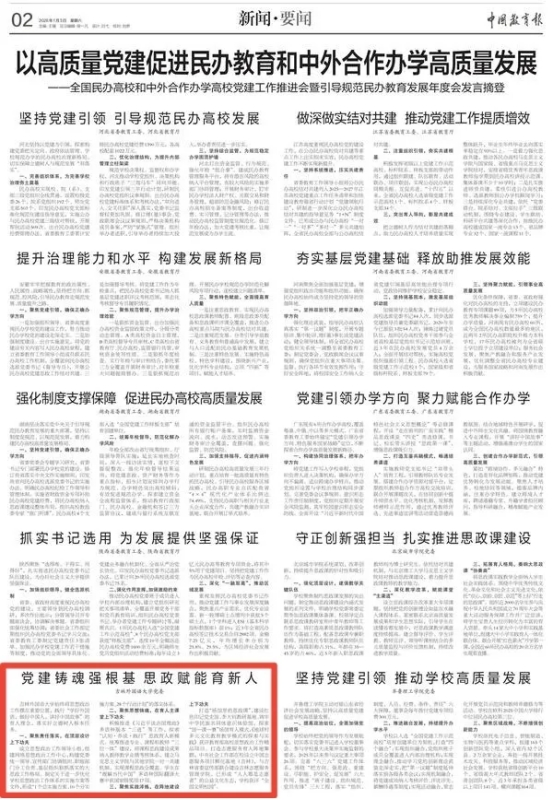 2026年1月3日,《中国教育报》第2版以《以高质量党建促进民办教育和中外合作办学高质量发展》为题,报道了吉林外国语大学的交流发言。