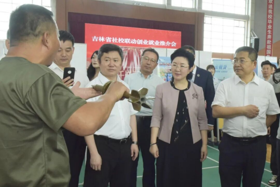 秦和代表(前排右二)参加吉林省社校联动创业就业推介会,到参展单位调研。
