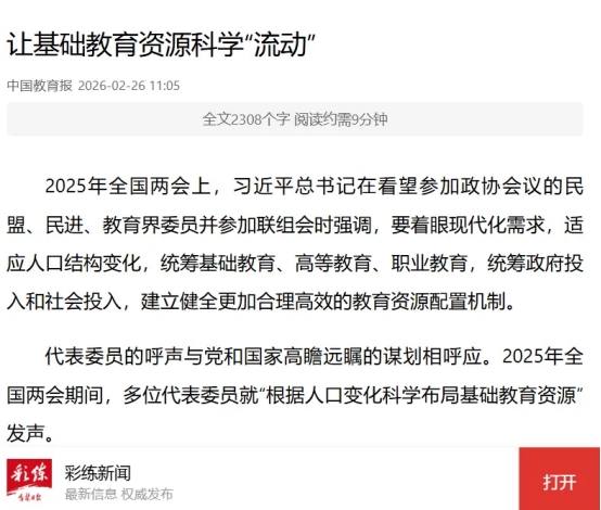 2025年全国两会上,习近平总书记在看望参加政协会议的民盟、民进、教育界委员并参加联组会时强调,要着眼现代化需求,适应人口结构变化,统筹基础教育、高等教育、职业教育,统筹政府投入和社会投入,建立健全更加合理高效的教育资源配置机制。代表委员的呼声与党和国家高瞻远瞩的谋划相呼应。2025年全国两会期间,多位代表委员就“根据人口变化科学布局基础教育资源”发声。
