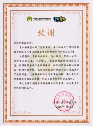 1月16日,吉林外国语大学收到中国儿童少年基金会致谢函,对学校在“守护童年·牵手共成长”2025年暑假关爱服务儿童活动公益项目中的热情参与和鼎力支持表示感谢。