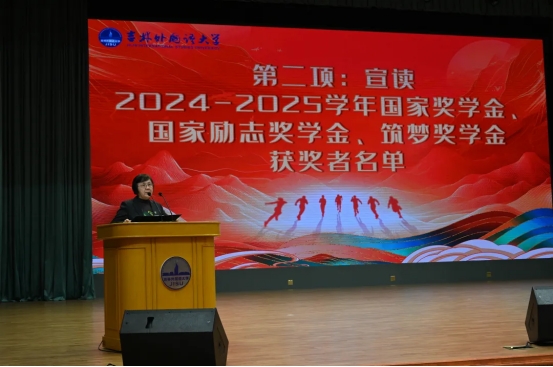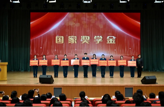 副校长杨春梅宣读2024-2025学年国家奖学金、国家励志奖学金,2025年度筑梦奖学金获奖者名单,校领导为获奖学生代表颁奖。