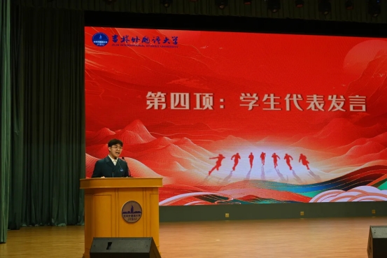 国家奖学金、校长奖学金、长春市十佳大学生获得者,国际传媒学院汉语国际教育专业2023级本科生董峻祎同学作为学生代表发言,分享学习心得与成长感悟。