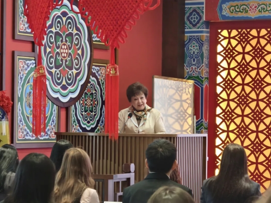 俄罗斯赤塔四中教师代表致辞,感谢学校的热情接待与精心筹备,期待通过研学活动加深两国青少年交流,推动中俄教育合作持续发展。