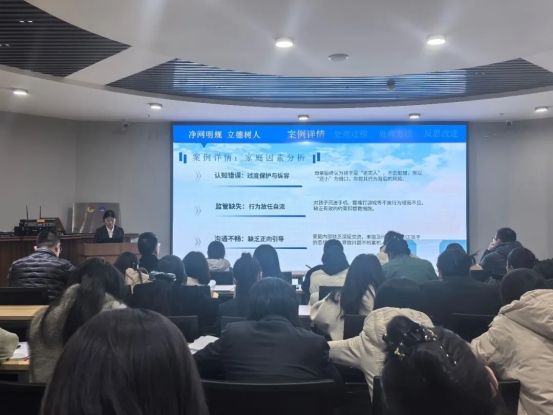 辅导员李晓博和周子淇分别就网络思政育人和心理危机干预进行案例分享。辅导员陈泽源和冷佳奇作为辅导员工作室负责人,针对分享案例进行深入剖析。与会辅导员交流工作心得,共同探讨育人路径。