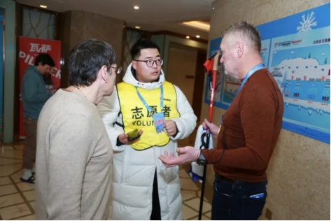 吉林外国语大学的学生志愿者为第二十四届中国长春净月潭瓦萨国际滑雪节的参赛选手提供服务。